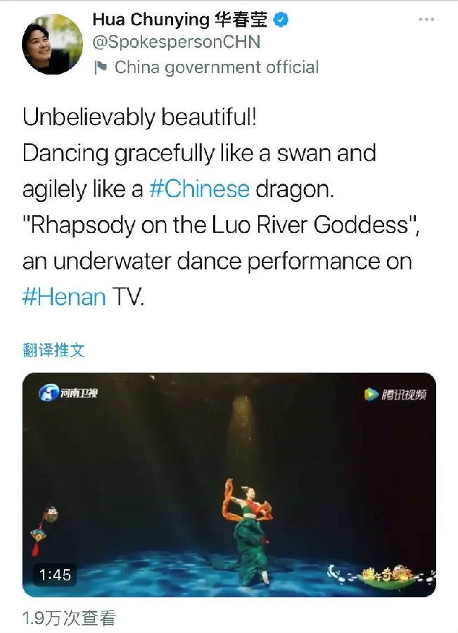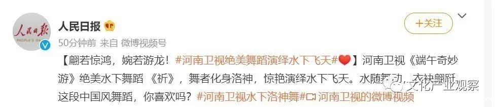 此次《端午奇妙游》的《洛神水赋》首先在微博以及快手上实现了爆发式的传播。在晚会首播的几天内,#河南卫视杀疯了#、#端午奇妙游#、#洛神水赋#等十多个词条登上热搜,带来了数十亿的微博阅读量。在外交部发言人华春莹在外网的转发之后,影响力又更上了一层楼。