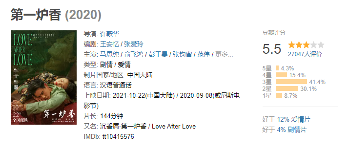 近日,由张爱玲小说改编的电影《第一炉香》上映,许多网友直呼“诈骗”,表示第一炉香变成第一炉钢。电影口碑扑得轰轰烈烈。