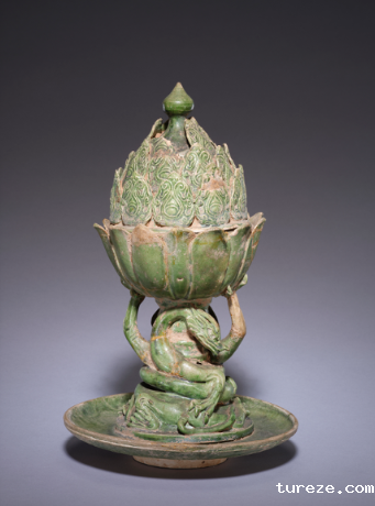 隋 绿釉蟠螭座托刻莲瓣带盖博山炉 故宫博物院藏