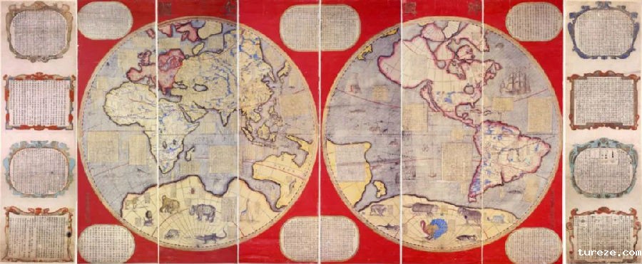 作为清初的一幅世界地图,《坤舆全图》不仅描绘了新航路开辟后,欧洲人对海陆分布的最新认知,还在地图空白处绘有船舶及数十种奇异的海陆生物,并附上文字注解。