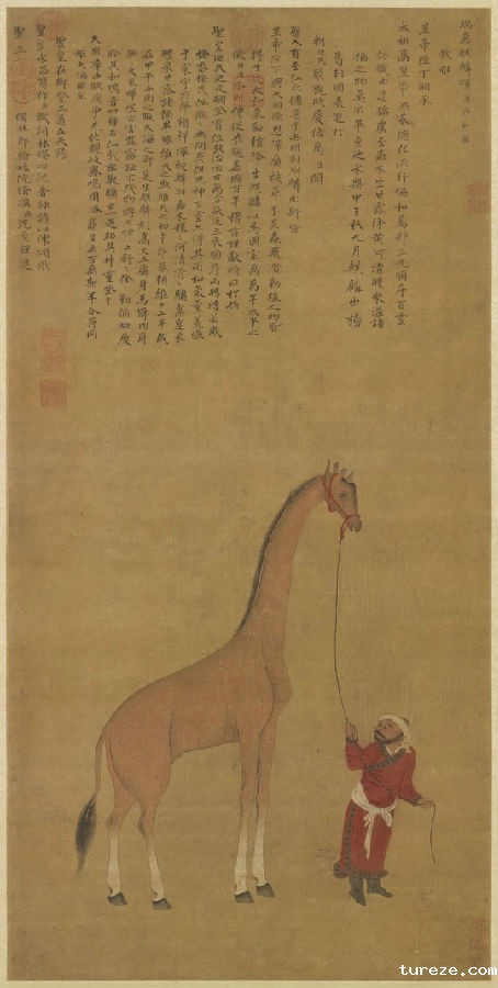 明成祖永乐十二年(1414年)秋,榜葛剌(今孟加拉一带)的使臣带着长颈鹿进贡。麒麟,自古以来被认为是仁兽,象征帝王仁德,它的出现让大臣们都借此机会歌功颂德,宫廷画师画下麒麟的画像,并将翰林院的大臣沈度所作的颂词《瑞应麒麟颂》抄录于上。