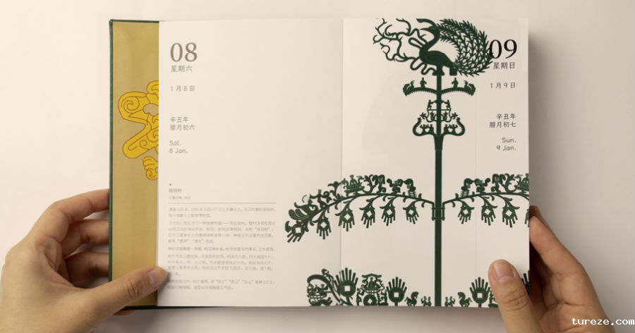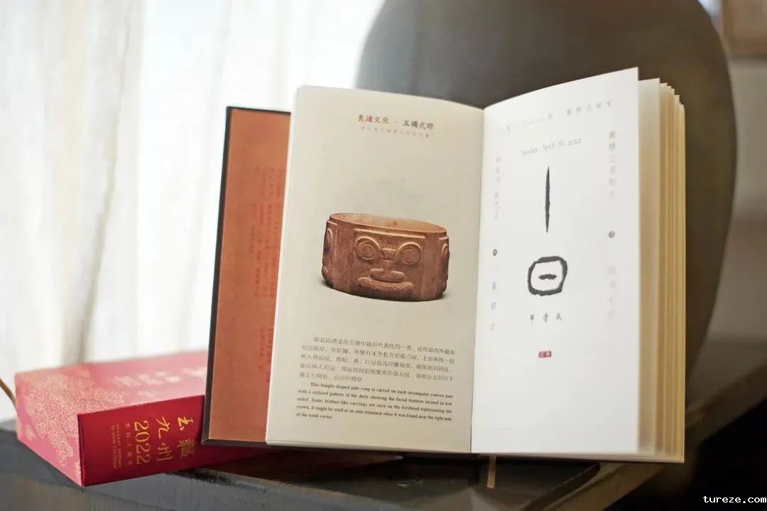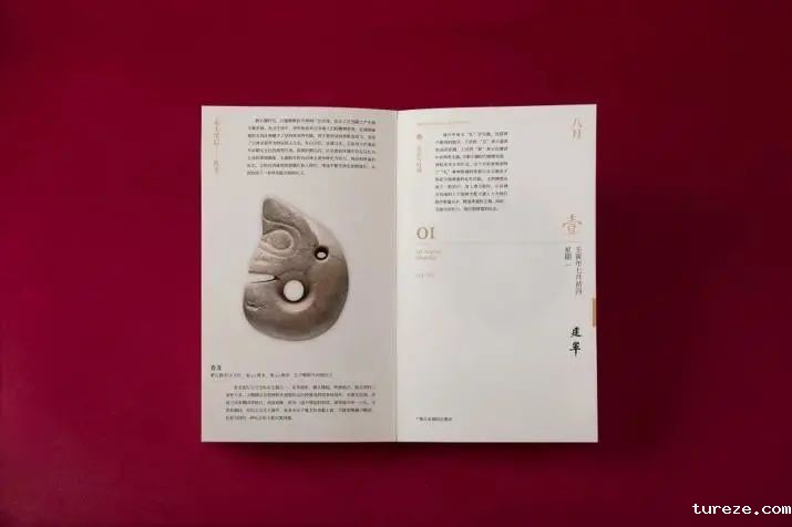 封面徽章纹样取自馆藏汉代虎纹韘形玉佩,每月月首页的纹样则源自书中的玉器文物,时而交错盘绕,时而流畅飞扬的线条,不仅彰显着千年古玉的神秘与灵动,仿佛史前人类与天地神明交流对话的远古密码。