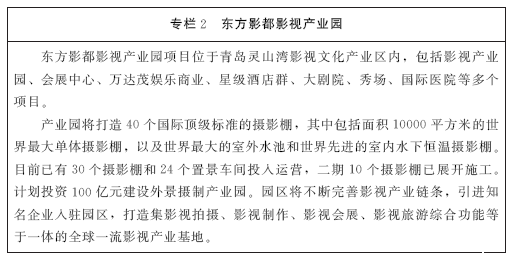 以青岛被联合国教科文组织命名为“世界电影之都”为契机,大力扶持青岛灵山湾影视文化产业区做大做强,支持青岛市建设全球影视文化中心,突出电影元素,打造全国乃至全世界电影重镇。