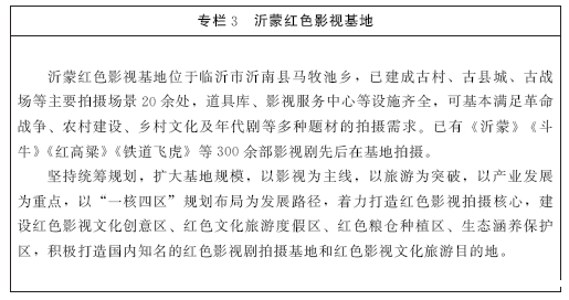 打造沂蒙红色影视基地。推动临沂市做好沂南县马牧池“沂蒙红色影视基地”规划建设,加快综合开发,优化发展布局,加强配套设施建设,扩大基地规模,实现影视产业集群化,打造影视文化旅游休闲聚集平台。结合基地红色文化底蕴,立足红色题材拍摄、红色教育体验和红色旅游开发,做好与红色教育培训、红色旅游的结合文章,建成国内一流的革命历史题材影视剧拍摄基地和红色教育培训、红色旅游基地。依托园区优势,召开全国红色影视剧高峰论坛(研讨会)。进一步发展壮大临沂国际影视城和夹谷关影视基地,形成抱团发展、协同发展格局,把临沂打造成红色影视剧创作生产重镇。