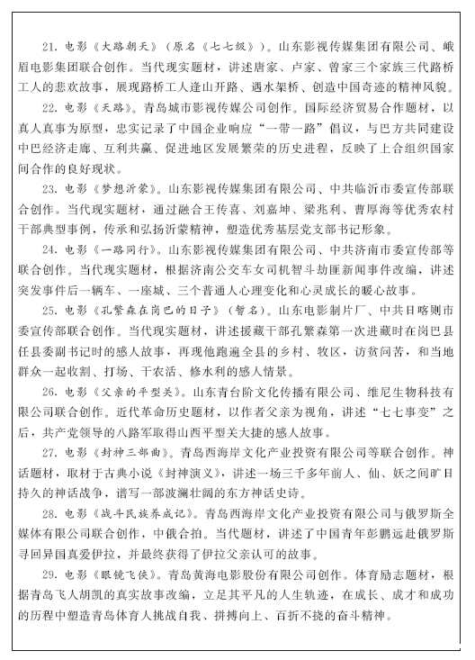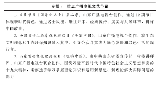 实施省级影视精品推进计划,到2022年扶持创作生产100部优秀影视剧,推动我省影视业持续繁荣。突出重大主题创作,围绕改革开放40周年、新中国成立70周年、全面建成小康社会、建党100周年等党和国家重大宣传期和宣传节点,创作生产一批讴歌党、讴歌祖国、讴歌人民、讴歌英雄的优秀影视精品。继续发扬鲁剧弘扬主旋律、关注现实生活的优良传统,进一步展现社会变迁和人物群体命运、反映普通人追梦中国、追求幸福生活的平民叙事,讲好新时代中国故事。进一步支持农村、少数民族、少儿、优秀传统文化等体现公益导向的影视作品。支持“小成本、大情怀、正能量”的影视作品。