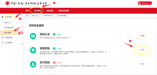 3.2老用户首次登录系统后,需要先修改登录密码;点击首行菜单栏[会员系统],点击左侧导航栏[会员信息],点击[安全设置],点击“登录密码”选项后面的[修改]按钮,进入修改页面,输入相关信息后点击[确定],即完成密码修改。