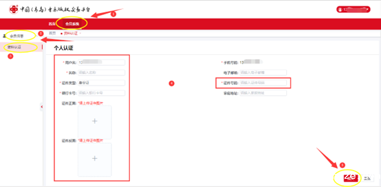 2、登录后点击[会员系统],点击[会员信息]-[资料认证],进入信息填写页面。