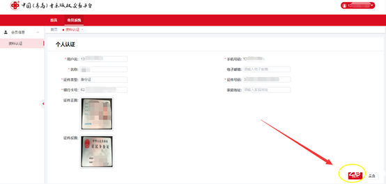 3.1个人用户默认用户名为注册时所填写的手机号码,默认证件类型为身份证,请准确填写本人信息,“名称”请填写本人姓名(需要与身份证信息一致且为注册手机号的持有人),并请填写本人证件号码,这页所填写的银行卡号预留手机号须与注册手机号保持一致(否则将会影响后面的签约及交易),并请上传真实的证件正、反面照片(正面上传人像面,反面上传国徽面)后,点击提交,认证完成。
