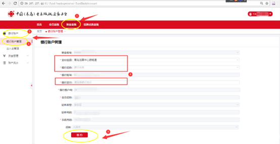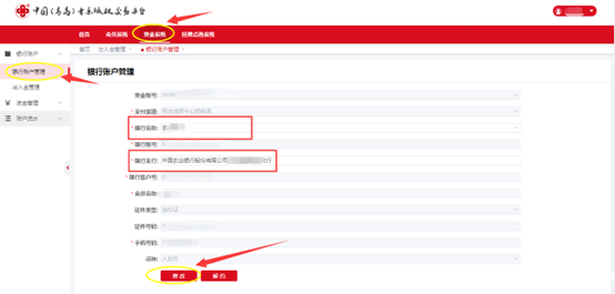 3.1登录后点击[资金系统]-[银行账户]-[银行账户管理],进入页面后,按照已经填写且绑定的银行卡账号,将对应的“银行名称”、“银行支行”信息选择为银行卡的正确信息,点击[修改]保存。