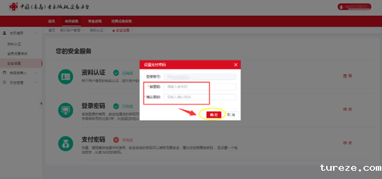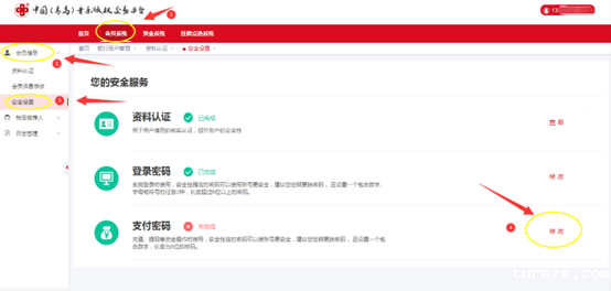 点击首行菜单栏[会员系统],点击左侧导航栏[会员信息],点击[安全设置],点击“支付密码”选项后面的[修改]按钮,进入修改页面,输入两遍相同的6位数字密码后点击[确定],即完成密码修改。