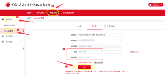 登录[中国(青岛)音乐版权交易平台]官网后,点击[资金系统]-[银行账户]-[出入金管理],点击[出金],输入需要转账出金的金额及支付密码(支付密码请在[会员信息]-[安全设置]-[支付密码]选项内进行修改),点击提交按钮即完成出金。