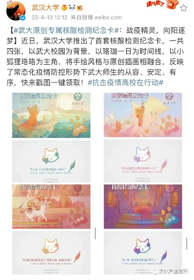 此外,武汉大学推出一套核酸检测纪念卡,以武大校园为背景,以珞珈一日为时间线,以小狐狸珞珞为主角,将手绘风格与原创插画相融合。