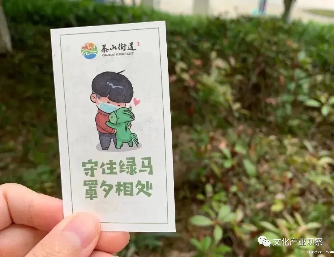 而在背面还有“守住绿马”“罩夕相处”等诙谐幽默的漫画及小短句,鼓励居民们众志成城,积极抗疫。